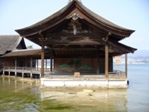 予定より早く着いたので、大鳥居を見に行く。ちょうど潮がひいていて鳥居まで歩いて行けた。さすが、デカイ。なにより主柱が太く周囲10mもあるらしい。天然の木そのままで、下の方ほど太くなっているのも印象的。