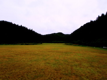山の方へ行き、ラジコン飛行場での展示へ。遠くの方に見える一直線の構造物が作品。