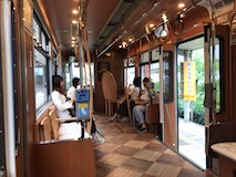 たまたま来たのが観光用の車両で、木の感じと外を見るための席配置が独特で良い。