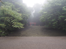 霧島神社本殿へ。高い木に覆われた山道を抜けるとぱっと広がる朱の社殿。で、奥のほうにある黒い本殿、が今日は霧の中にありとても幻想的。