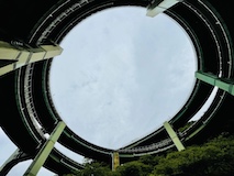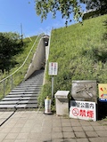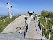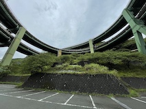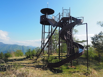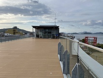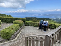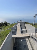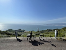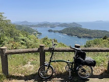 大島上陸。今日は十分に時間があるので、亀老山展望公園へ。あるていどわかってはいたがブロンプトンで登れるようなところではなく、 3.5km押して登る。500mごとに距離と藻塩アイスの看板があり、これはアイス食べないわけにいかない感じになる。3kmほどは景色いいほどでもないが、最後は海側が開けていてきもちい感じになる。で、ざっと40分もかかって亀老山展望公園へ。こちらは隈研吾作品の展望台。見晴らしがすばらしいだけでなく、展望台なのだが外から見えない作りになっているのもすばらしい。