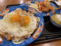 焼豚の煮汁を使った甘めのあっさりタレのかかった焼豚丼んい目玉焼きがドーンと乗っている。ガッツリに見えて意外とあっさりいただけ女性にも人気なのがわかる。