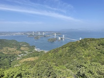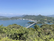 早速道を外れて、糸山展望台から、来島海峡大橋を望む。天気が良くってよかった。