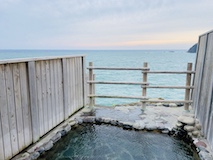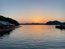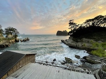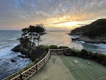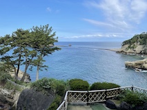 今日の宿は堂ヶ島にある清流さん。湾になったところの断崖の上に立っていて部屋からの景色がいい。夕日もいい。で、海に近い高さにある露天もいい。しかも貸切状態で最高。