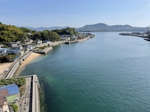 ここでルートを外れて瀬戸田水道を超えて、隣の高根島へ。黄色が印象的な高根大橋から瀬戸田水道を見ると海というより川。