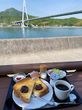 生口大橋を渡り、因島へ。橋の付け根に、海が見えるテラスのあるカフェ「菜のはな」さんにてトーストのセットをいただく。