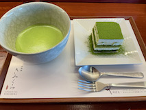 新茶買いに掛川のきみくらさんへ。ティラミスと抹茶のセットがいい。で、このお抹茶もいただく。すっきりビター。