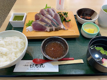 御前崎のなぶら市場で鰹のタタキ定食いただく。うまい。やっぱこのご時世でお客さん少なそうで、いろいろ安くなってた。