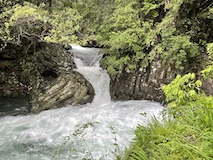 ループ橋を降りて、河津七滝へちょっとだけ。出合瀧も大滝も、昨日の大雨で水量増して大迫力。出合橋では柱状摂理の6角柱の岩がすぐ目の前で見られるのがいい。