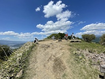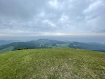 一時間ほど走り、だるま山山頂への道の駐車場へ。山頂への最寄りの道は車2台くらいしか置けないのだけど運良くおけた。山頂まで整備された尾根を500mほど。雲に入ったり出たりで良くわからないまま歩き山頂へ。曇って何も見えないのと、人多いのと、虫が異常に多い。