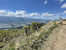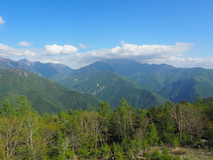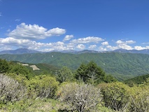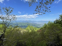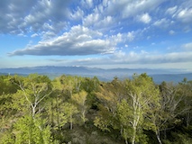 陣馬形山のキャンプ場の先に展望台があり、芝や木製の道が整備されていて歩きやすい。展望台では木がないので眺望がいい。ここからみて右から左に流れる天竜川。それに向かって中央アルプスの山々から流れてくる何本もの川があり、それぞれ河岸段丘になっていて、そこに田畑があったり、その段丘を越えるように橋がかかっていたり、特異な地形とそれを生かした生活がみられるのもいい。