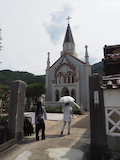 山口サビエル記念聖堂へ。平成になって消失して建て替えた際に、2本の塔と三角錐の2階建のお堂。1階は資料館的な展示で、2階が講堂になっている。真っ白な空間に濃い色のステンドグラスが生える。水が溜めてあり反射した光がゆらゆら揺れて天井を照らす演出なんてとてもいい。