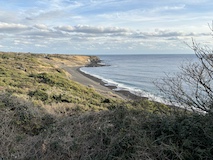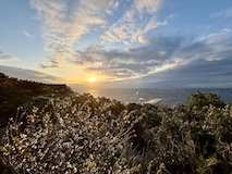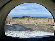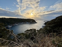 高台に登ってぐるっと回る。昨日は気が付かなかったけど、火口からできたというのがよくわかるくら見事な円形で断崖の湾。古い家が残る住宅街を抜けたところで竜王崎への道が出てきて程なく岬に出る。大島桜越しの水平線から登る朝日がいい。ここは鉄砲場ということだが、黒船に備えて作られたそうで、その後世界大戦時にも防空壕や重機関銃の設置場所となっていたそう。遠くに見える三原山の上の方が白いのが気になる。