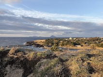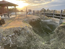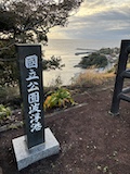 波浮湊の断崖の上をグルーっと周り見晴らし台まで。これまた朝日がいい感じ。外海がかなり荒れているが、内海は静かなのもみえる。