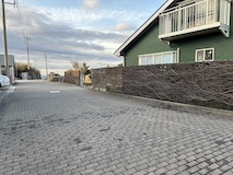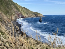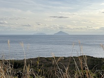 今日は、ゲストハウスのオーナーさんがツアーをやられているということで、黒砂漠、三原山を案内してもらう。今日の予約は俺だけなのでコースは自由聞いてもらった。まずは島の東側を北上する。最初のスポットが筆島。こういうのはよくあるのだが、普通は島につながっていたのが削れたパターンやけど、この筆島は大島よりも古く、そしてマグマの通り道なのだそうで、でき方が違う。