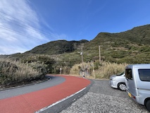 しばらく進むと坂を登り始める。といってもアスファルトでくねくね道なので登りやすい。途中退避シェルターが何箇所かあった。霧島以来やな。