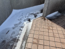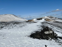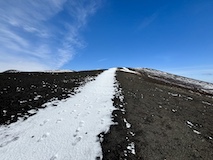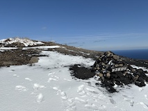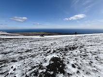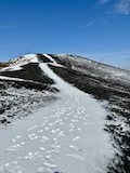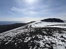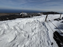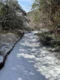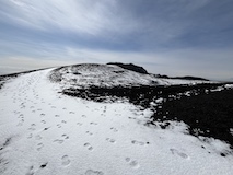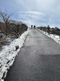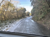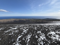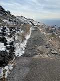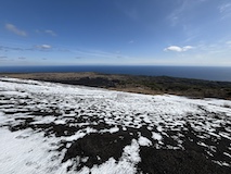 日本で唯一の砂漠、黒砂漠へ。月と砂漠ラインを走るのだが、今日は大島としては珍しく雪や凍結でなんとか終点の駐車場に到着。ちなみに、数台しか車が止まってなかったのでガラガラやんと思ってら、これでも多い方らしい。遊歩道に入るとスコリアで黒いはずが、雪で結構白い。