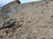 三原山のお鉢に到着。まさか舗装路のままいけるとは。周辺にはでっかい岩がごろごろ。マグマの飛沫が積み重なってできたのだそう。迫力ある。