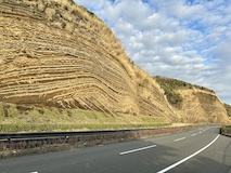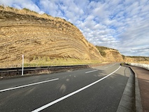 とくに地層大断面はお見事。走ってて突然出てくる。630メートルもありみえる限り断面の壁が見えていて、スコリア、火山灰などが繰り返し積もってきた1万5千年分が見られる。これ見るだけでもここにきた甲斐がある。