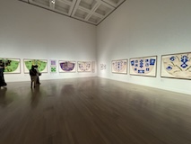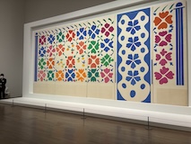 マティス 自由なフォルム展へ。初期のフォービズムのイメージが強いがこの展覧会は切り紙絵画がメインになっていた。8mの大作や晩年のロザリオ礼拝堂の建物から上祭服の雛形と総合芸術的な面が印象的やった。