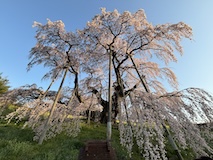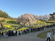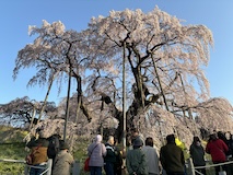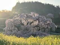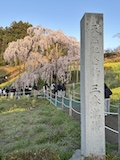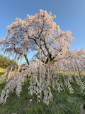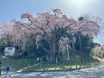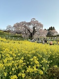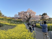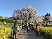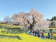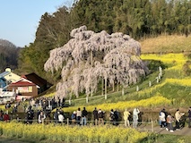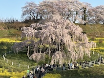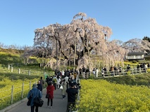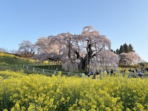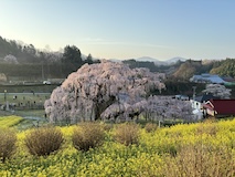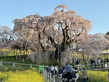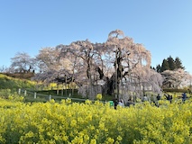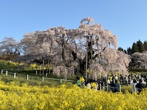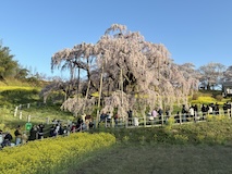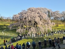 5時半少し前に三春滝桜の会場に到着。入場料がいるとのことでオンラインチケット買ってきたのに、6時前だからゲートはオープンでいらなかった。公園のなかを少し進むと菜の花越しに滝桜がでてきた。エドヒガンの枝垂れ桜。樹齢は1000年以上。桜の木としては日本で最初の天然記念物で、四方に広く伸びたえだから枝垂れているのが滝のようということで滝桜と呼ばれているのだそう。
