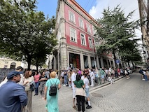 で、たどり着いてみると塔に登るのに人数制限の時間制となってた。運良く30分後のチケットが買えたので、教会を見て(めちゃ豪華)、周辺を散策。近くに世界一美しい書店として有名なレロ書店。1900年頭に作られた見た目にもファンタジーなところ、だが、めっちゃ並んでる。こちらはタイムスロット制じゃなくて並ぶ制らしく、このブロックの横まで、しかも何列か並んでて、1時間どころじゃ入れそうにない。ということでスルーして散策。このあたりはコルドアリア庭園を中心に近代的なモールや大学もあり文化的な印象。アルマス教会ほどではないが、こちらもアズレージョの壁が見事なカルモ教会などを見て、クレリゴス教会へ戻る。