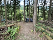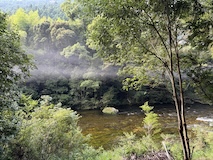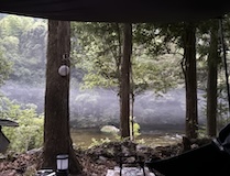 鳳来のソロ専用キャンプ場。朝テントから出るとみごとに川霧が出てた。幻想的でよかった。