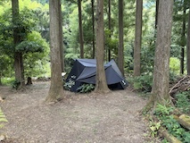 近場のキャンプ場へ。鳳来のソロ専用キャンプ場。幹線道路は川向こう、周りに家も何もない。人気キャンプ場なので満員ではあるが、ソロ専用なのと横に長いキャンプ場なので、人の気配はあるが声ひとつ聞こえないという安心感あるいいところ。線路沿いではあるのだがそこは飯田線なので1時間1本来るかどうかくらい。
