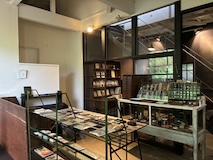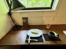 古い校舎に入るような扉(ここにも看板も Openの文字もないので開けていいのか不安)を開けて入ると、古本に文房具がアンティークに見えるような丁寧な並べ方で販売されていて、その奥にかなり落とした照明のカウンター席がある。とても静かながら温かみのある雰囲気。コーヒーとピスタチオのチーズケーキをいただく。とても静かでよかった。2階席もあるみたい。