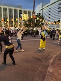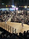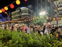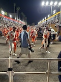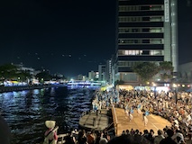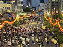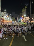 あちこちにステージがあり、脇では次の連がまっている。連の踊りの最後には、みなさんもどうぞ、と観覧者参加型に。阿波踊り独特なのは、観覧者の多くがその輪に入ってく。観覧場所だったところが踊りの輪になるくらいみなさんが参加するので、かなり後退。地元らしき人はうまいが、とりあえず輪に入って歩くだけでもいいらしい。連という形での演舞ではあるけどもみている人も参加できるてんが人気なんやろな。そして演舞場ではかなり大所帯の踊りが見られ迫力がある。
