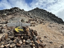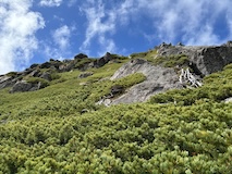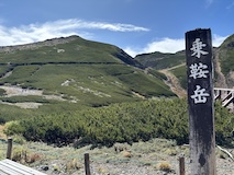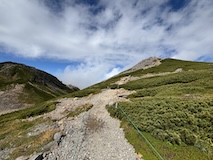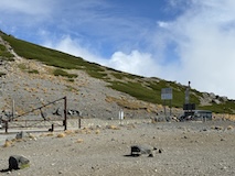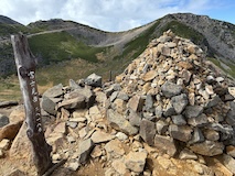 まっすぐ剣ヶ峰でもよかったが、ここ最近やっていた富士見とつくところ巡りがあるので、まずは富士見岳へ。歩きやすい道ではあるが標高高いだけにゆっくり30分かけて2817mの富士見岳に到着。いちおう富士山は見えるらしいが、北岳、仙丈ヶ岳越しなのでたぶん見分けられないくらいかと。