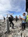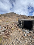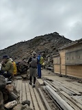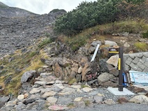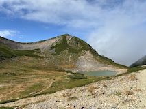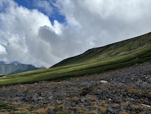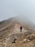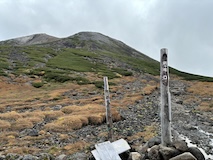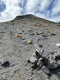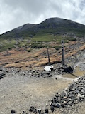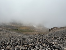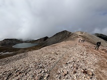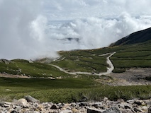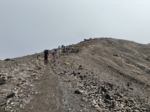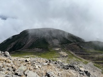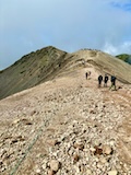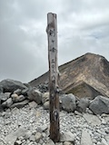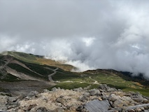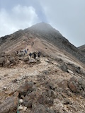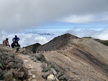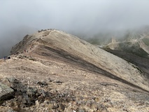 剣ヶ峰を目指して一旦降り、作業車が通る道を進み、肩の小屋から、岩場の斜面に入る。とはいえそこまでハードではないのでゆるゆる登る。高山病は来ないが、とりあえず酸素が薄い感じがでてきた。しばらく進んで尾根に出る。あ、これ見たかったやつと満足感もある。ちょっと霧が濃いけど。
