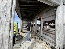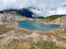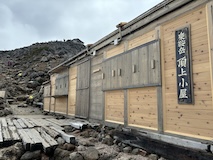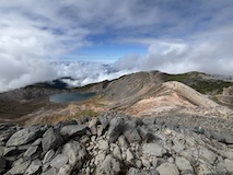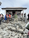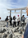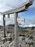 富士見岳から休憩入れつつ2時間ほどで剣ヶ峰3026mに到着。頂には神社があり、お参りと剣ヶ峰の碑のところで人がごった返していた。ちょいちょい晴れてきてくれて周囲を見下ろすことができた。しばらく見渡して下山する。