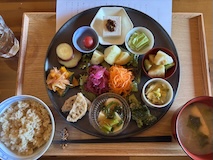 ようやく時間が来て、お店に入る。庭を眺めるお部屋にテーブルがあり、お家感がいい。メニューも少なめだが、いちいち手の込んだおかずの盛り合わせで、めっちゃおいしい。これが千円台は信じられない。いい時間を過ごせた。