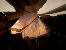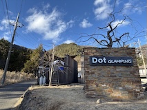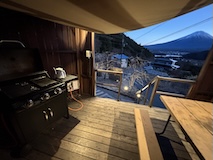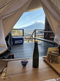 キャンプを、と思っていたが、少人数のグランピング、しかもテントというところを見つけたので、Dot Granpingさんへ。運良く、一番端のテントで河口湖と富士山がテントないから見えるいいサイトに。