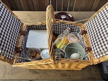 朝ごはんはバスケットで届くホットサンドイッチメインのセット。またしてもこたつから富士山見ながらホットサンド作るってのがいい。