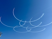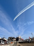 明日は小牧の基地でのエアフェスタとのことで、今日もブルーインパルスの展示飛行があるとのことで、少し離れたところで見る。浜松の時とは演目が違って、全機での演目が多くて楽しめた。