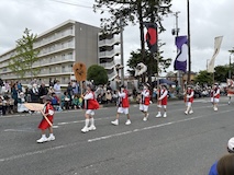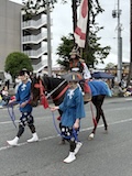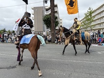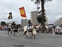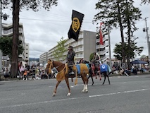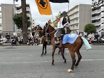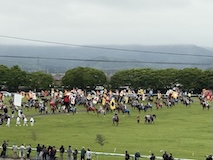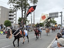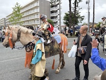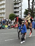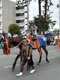 雲雀ヶ原祭場地の観客席に場所取りして、お行列を見るために野馬追通りへ移動。甲冑武者の騎馬がぞろぞろやってくる。なかには、女騎士やちっちゃな騎士もいはって、少しずつオープンになってきているとのこと。