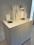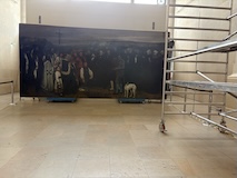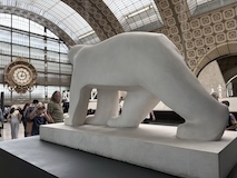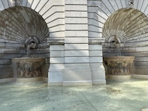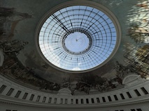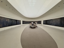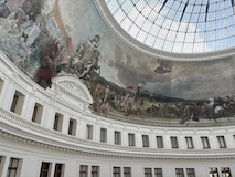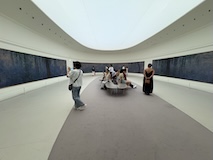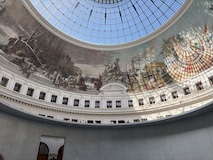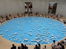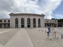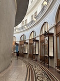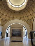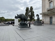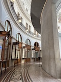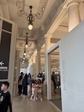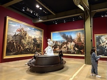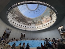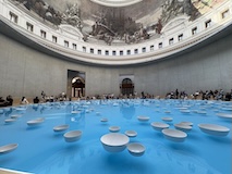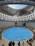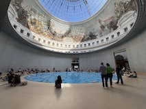 初日に行ったパレロワイヤル庭園すぐの元商品取引所やったブルス・ド・コメルス・ピノー・コレクションへ。ピノーが集めた現代アートの美術館。安藤忠雄さんが手がけたということで、外見は古代ギリシア風ながらも入ってすぐコンクリ打ちっぱなしの円環の壁が印象的。特別展示で中央にセレスト・ブルシエ=ムジュノの青いプールに白い磁器を浮かべたインスタレーション。以前ポーラ美術館でも見たが、規模が大きく、またこの建物にぴったりな展示。天井のドームの内側の巨大なパノラマ絵画に、社会に訴えかけるような作品群など、現代アートを建物ごと感じられるところやった。何気にちょっと感動したのが、給水機があるのだけど、まず、プラコップに入れるというのと、そこに炭酸水もあること。
