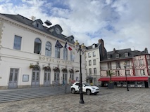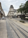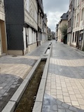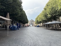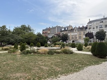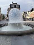 ランス駅は結構小さめかなって感じやけど、表に出ると緑の多いSquare Colbert公園を挟んで街に入る。両サイドにホテルやお店、レストランが並ぶドルエデルロン広場を歩く。岡山でも見た噴水などもありとりあえずテンション上がる。