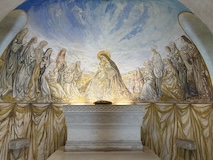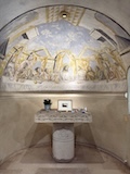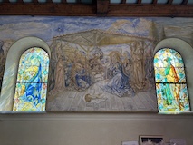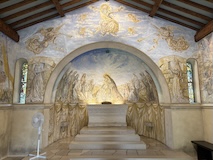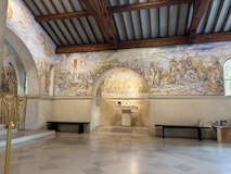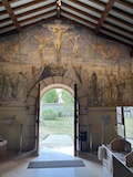 ノートルダム大聖堂ランスで洗礼をうけた藤田嗣治最後の作品フジタ礼拝堂。フジタが壁画だけでなく建築の構想や設計も行ったのだそう。シャンパーニュ・マムのワイナリーそばにあるのだが、礼拝堂はマムの社長ラルーさんの支援があって建てられたのだそう。礼拝堂は大きくはないが、一面フジタのフレスコ画とステンドグラスで埋め尽くされている。最後の晩餐やキリストの磔刑など、キリスト教の絵画がすべてフジタ調の淡い色調とあの独特な表情の人物で描かれている。よくみると、フジタやラルーの姿も入っていたり、建設に関わった人の名前が記してあったりというところも楽しめる。礼拝堂ということで、フジタ夫妻のお墓もある。フジタファンとしては寄っておきたいところ。