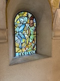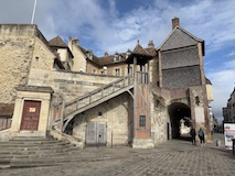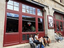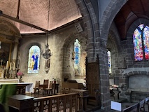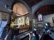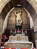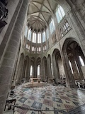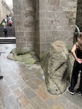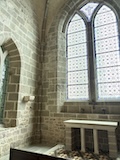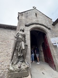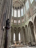 途中のサン ピエール教会へ。入り口にはジャンヌダルクの像がある。大天使ミカエルのお告げを聞いてフランスを勝利に導いたというモンサンミッシェルつながりとのこと。鎧を着てはいるが、勇ましいというよりは優しい感じが印象的。教会内は薄暗くひっそりした感じ。住人の数もあってだと思うがコンパクトながらもステンドグラスにマリア、ミカエル像にと見どころは多い。
