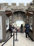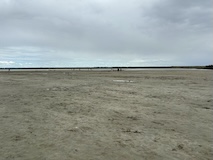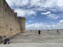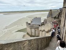 無料の周遊バスは駐車場からモンサンミッシェルへの橋の途中までを往復している。ふもとじゃなくて橋の途中というのがとても良くって、まずモンサンミッシェル全景を見渡せる。修道院、牢獄、というのが先行していたけど、実際見てみると思っていたよりも周辺に建屋が多く見え、一つの街や、城壁のように壁があるので要塞という印象。潮が引いている時間なので砂地からも見られた。で、城壁に入る。