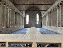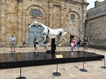 まず、頂上の広場に出る。めっちゃひろい干潟がわかる。そしてパリオリンピックの開会式などで出てきた銀の馬・ダンテが展示してあった。オリンピック以降フランスを巡回展示されているらしくて、今ココらしい。たまに動くのだが、あまりに滑らかですごい。