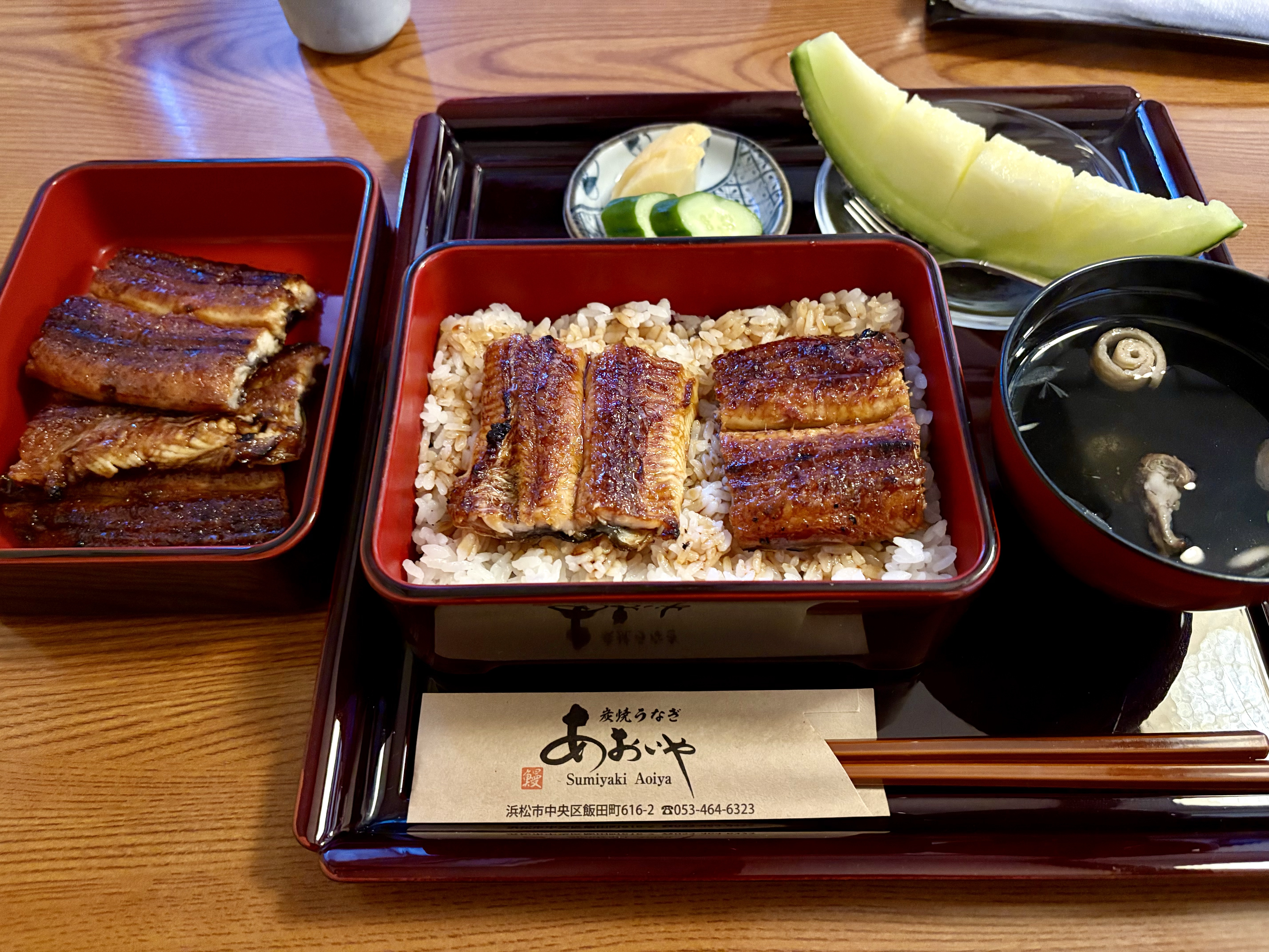 うなぎのあおいやさんへ。関西風の蒸さないタイプでカリフワで焼き上がっている。太めの鰻一本の特鰻重で正解。浜松のうなぎというわけでなく、その時その時で一番いい鰻を仕入れて、お店の井戸水でかけ流しているとのこだわり。