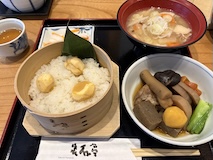 桜井甘精堂 泉石亭で栗わっぱ御膳をいただく。大きな机で広々した店内が気持ちいい。新年なので小鉢はお正月仕様の煮物。栗おこわのもちもち感もいい。
